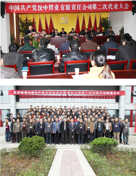 2011年11月29日至30日,中共漢中鋅業有限責任公司第二次代表大會在漢中鋅業公司隆重召開。大會選舉產生了漢中鋅業公司第二屆黨委、紀委,順利完成了黨委、紀委換屆工作。集團公司黨委副書記于留英,總經理助理、黨委組織部長汪小明到會指導。